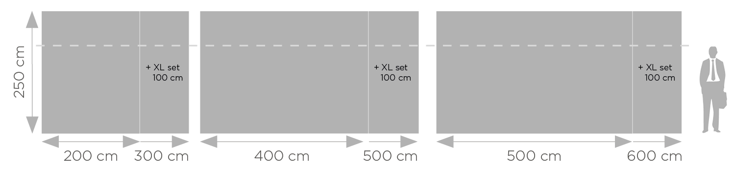 Il permet d'augmenter la largeur de chacun de ces systèmes de 100 cm (200x250 jusqu'à 300 cm, 400x250 jusqu'à 500 cm, 500x250 jusqu'à 600 cm).
