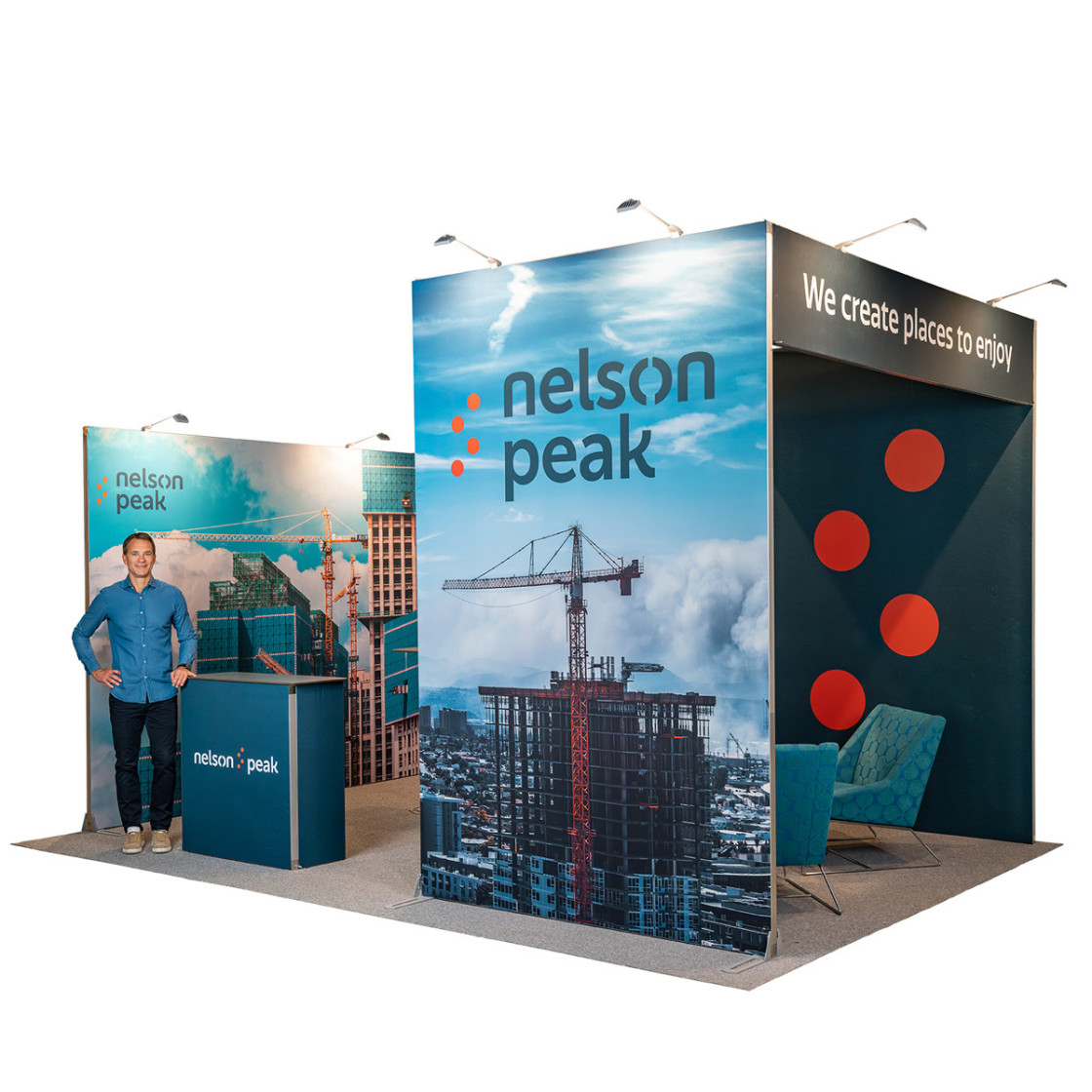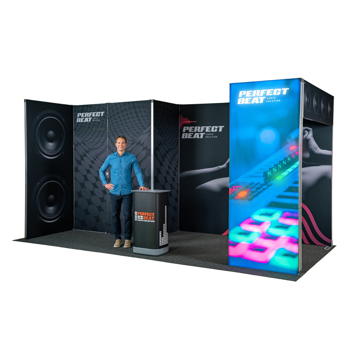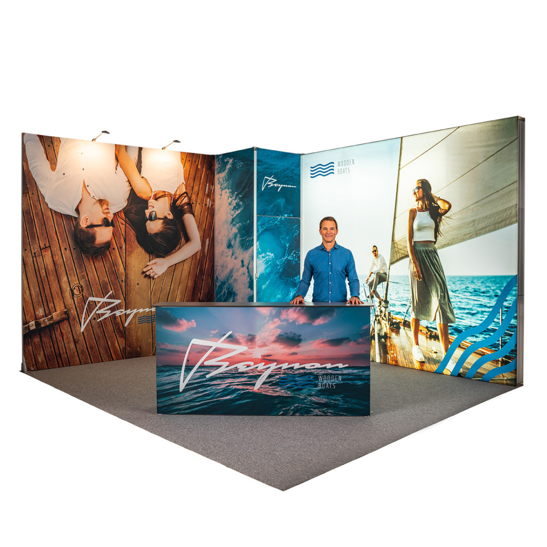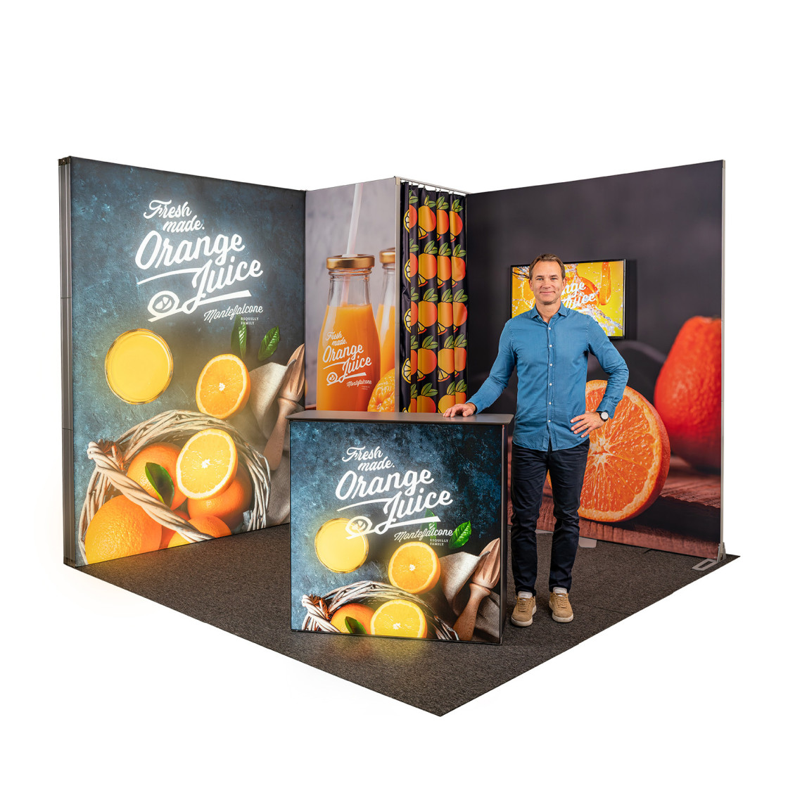 Kit de stand modulaire à angle ouvert prêt à exposer pour surface de stand 18m², montage simple et rapide sans outil.