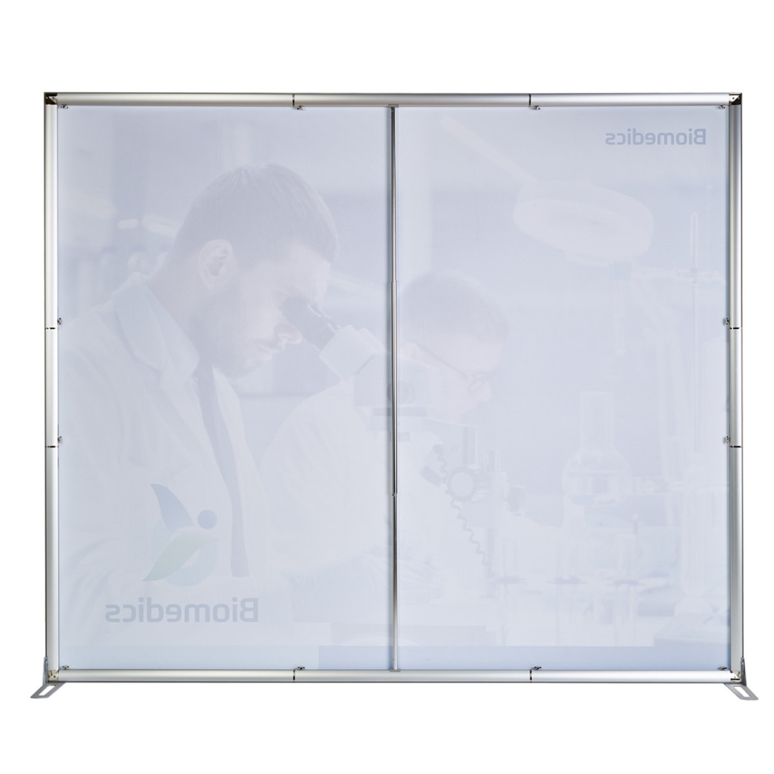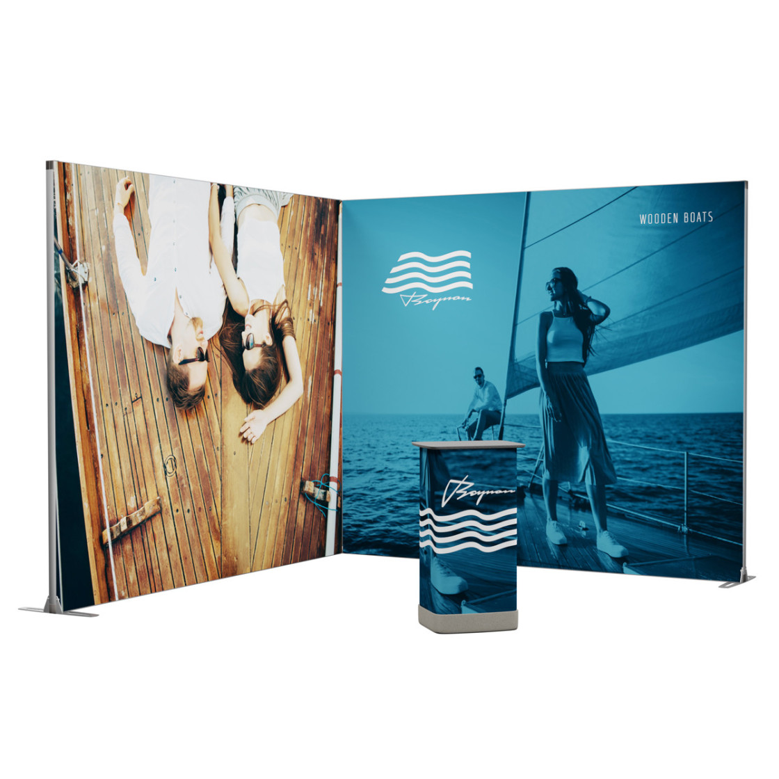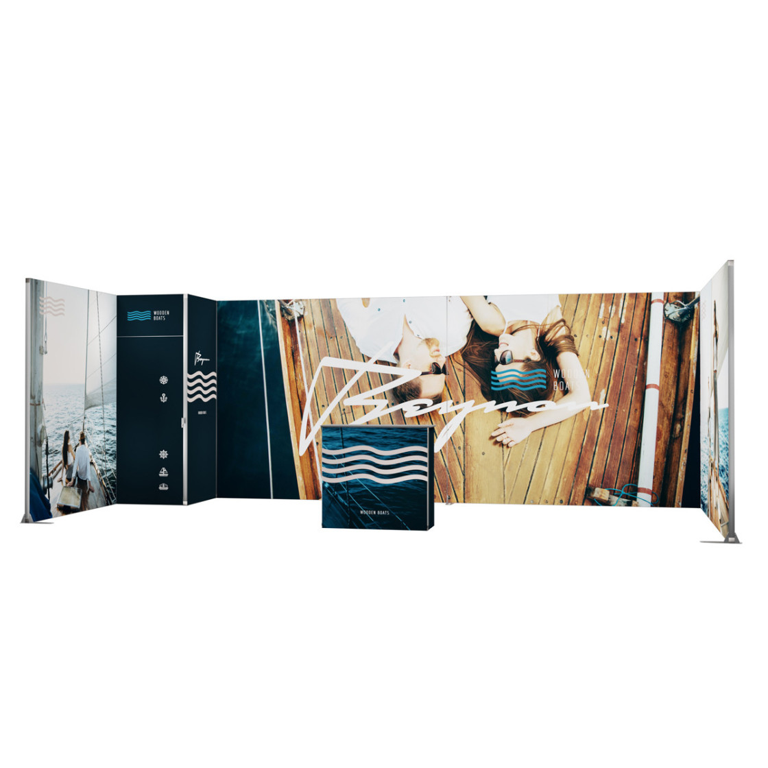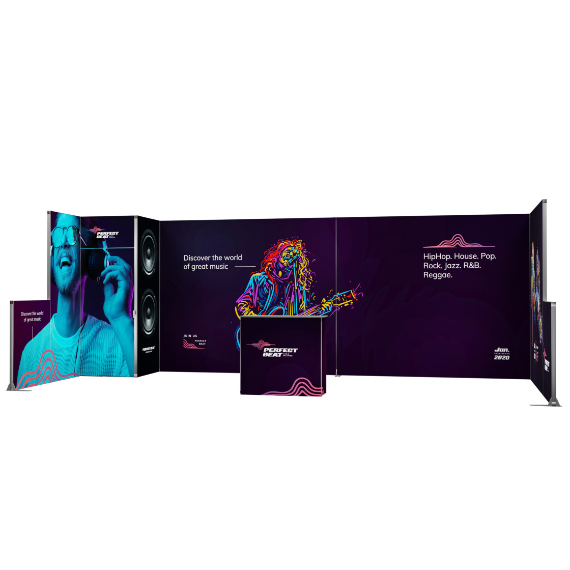 Ce kit comprend tout le nécessaire : éclairage LED performant (en option), bagagerie compacte facilitant le transport, structure en aluminium légère et robuste, et visuels en tissu tendu imprimés en haute définition. Le tissu occultant M1, doublé d'une matière bloquant la lumière, garantit un rendu sans transparence pour un effet visuel irréprochable.