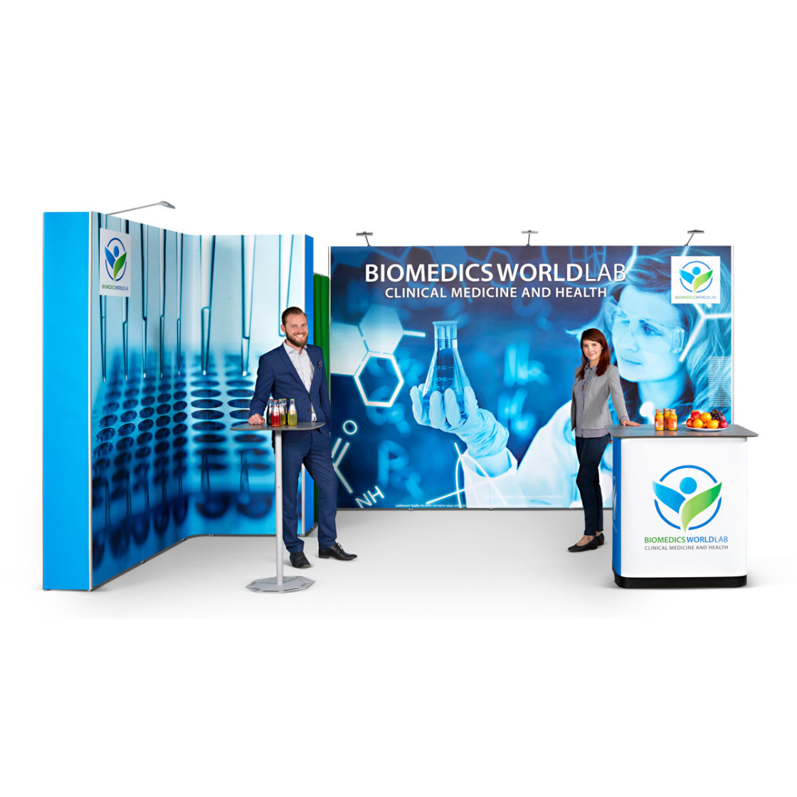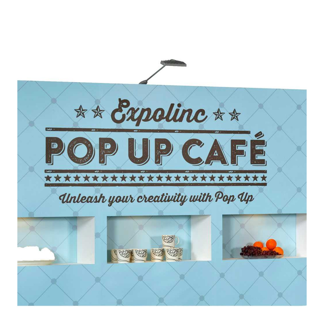 Le Stand modulaire 9m2 tout compris : BAT, impression des visuels, caisson de transport, éclairage.