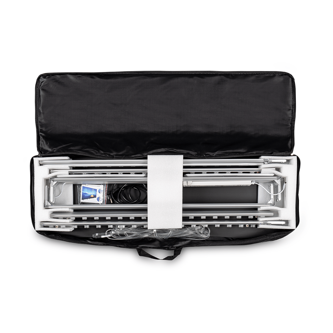 Le kit comprend: un système LED BOX™ 100x200cm, des connecteurs en série (4 pièces), une alimentation (1 pièce), un ruban silicone, une valise en carton.
